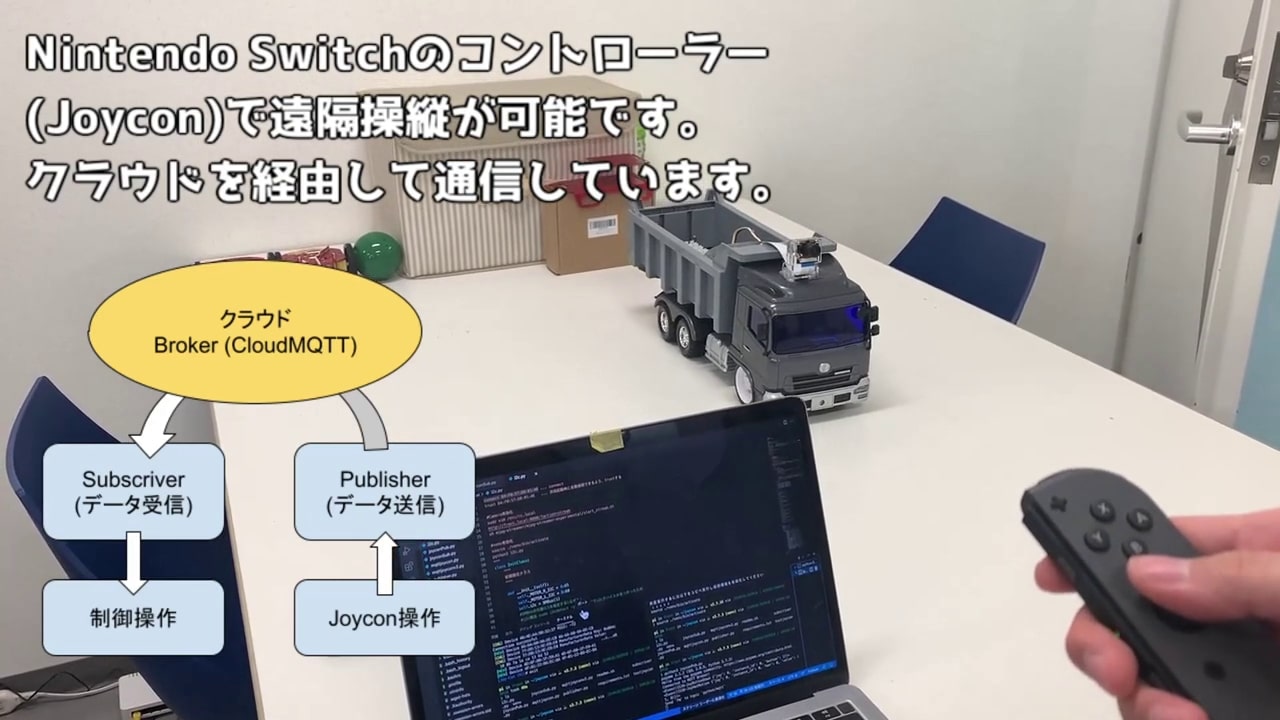 遠隔からの制御をするためにCloud技術を用いました。実際の現場ではネットワーク速度が十分に担保されていないため制御通信に必要な最低限の速度で通信をするIoT通信規格のMQTTを採用しました。
